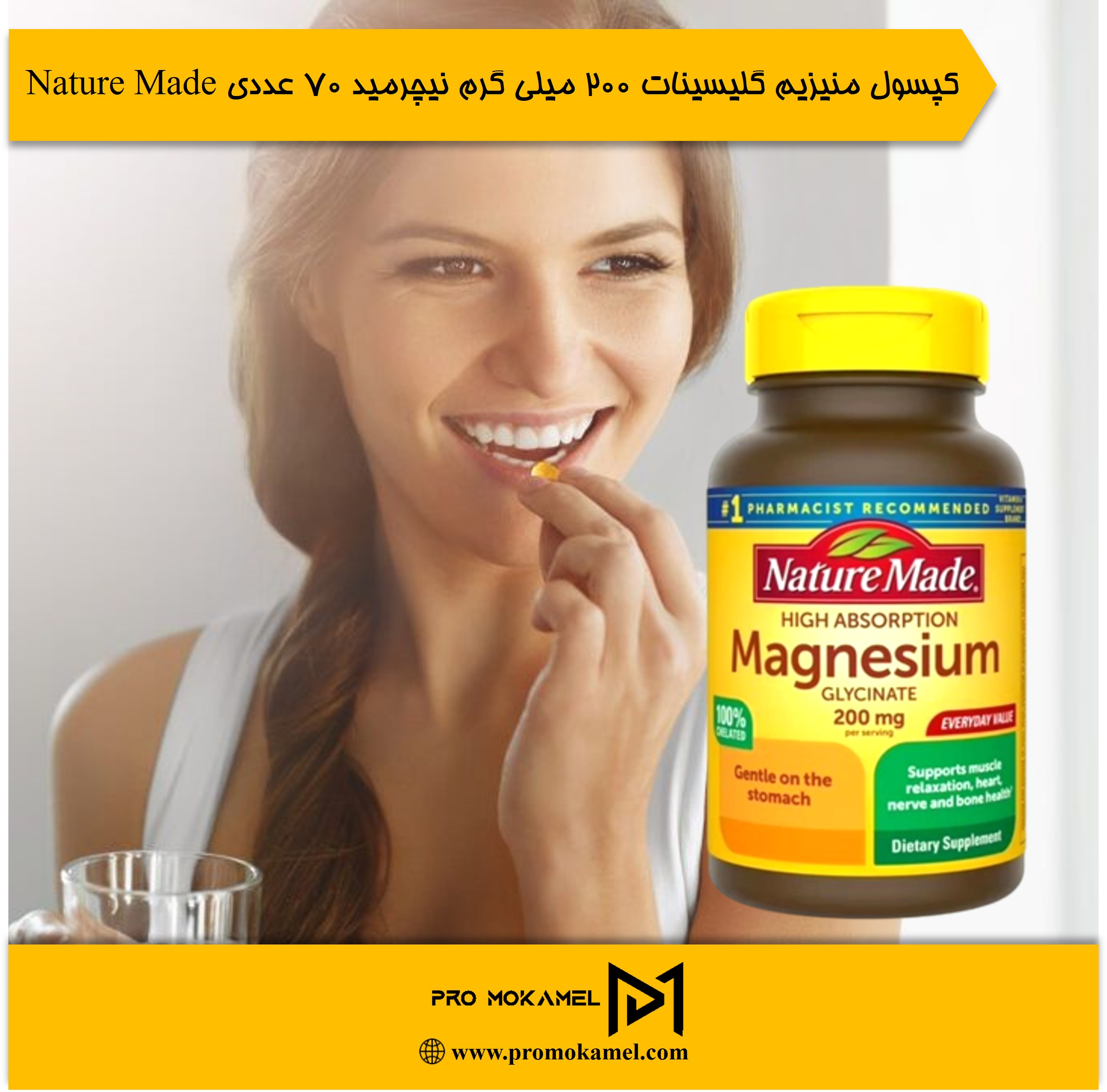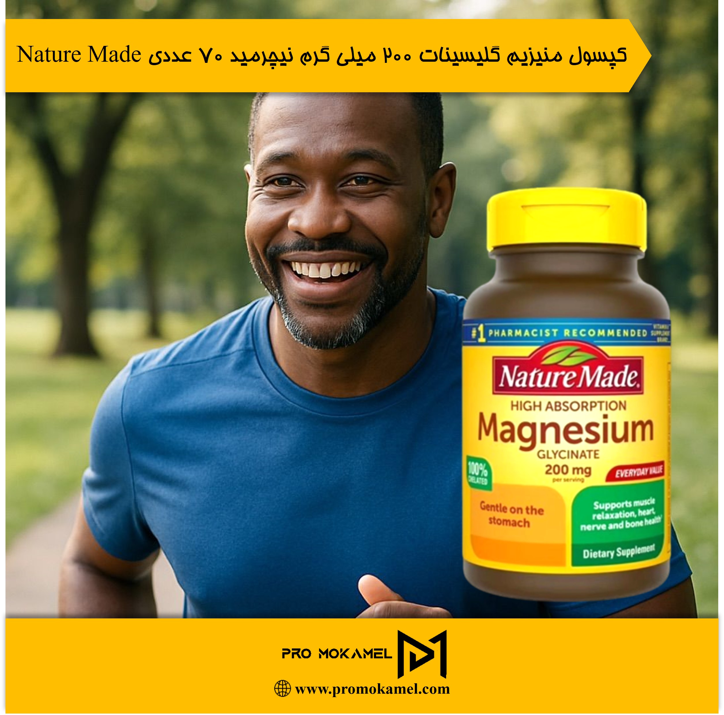 کپسول منیزیم گلیسینات ۲۰۰ میلی گرم نیچرمید ۷۰ عددی Nature Made یکی از شناختهشدهترین و باکیفیتترین مکملهای منیزیم موجود است که با استفاده از فرم بیسگلایسینات تولید شده؛ فرمی که نهتنها جذب بالایی دارد، بلکه ملایم و سازگار با معده است. این محصول در بستهبندی ۷۰ عددی ارائه میشود و برای افرادی طراحی شده که میخواهند سطح منیزیم بدن خود را بهطور مؤثر، ایمن و پایدار افزایش دهند.
